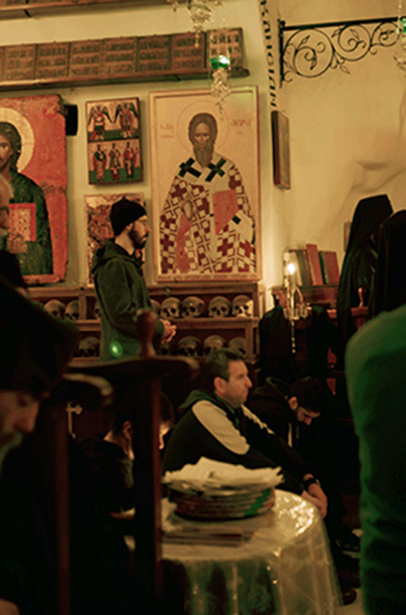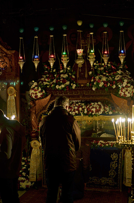 Avant les trois fêtes principales et ses agrypnies nous avons pu nous pénétrer de la vie monastique en nous calant progressivement sur le rythme quotidien des moines. Quelle émotion de descendre la nuit en étant appelé par la sonorité du chant byzantin qui monte de la nef de Saint Sabas. La première chose que l’on fait en entrant par la porte nord de l’église est d’aller se prosterner devant le corps du saint puis nous faisons le tour de toute l’église en vénérant chaque icône ; ensuite, soit nous prenons place dans une stalle, soit nous restons debout.